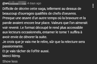 d’un lecteur qui compare deux livres achetés au même prix. Il ne parle ici que du tome 1 :